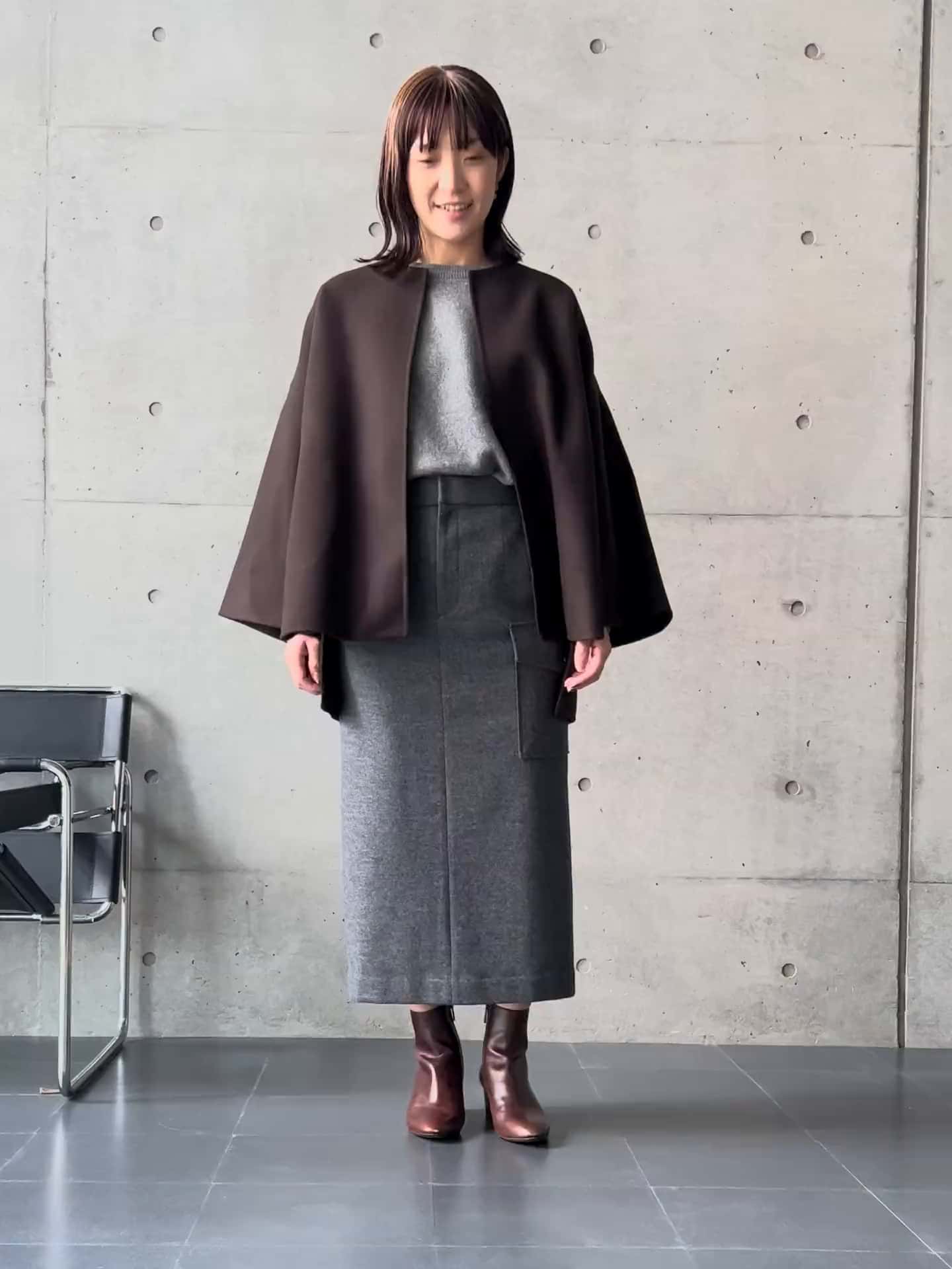 今回はグレーのニットとスカートでシックにまとめ、ブラウンのコートで全体を引き締めました。