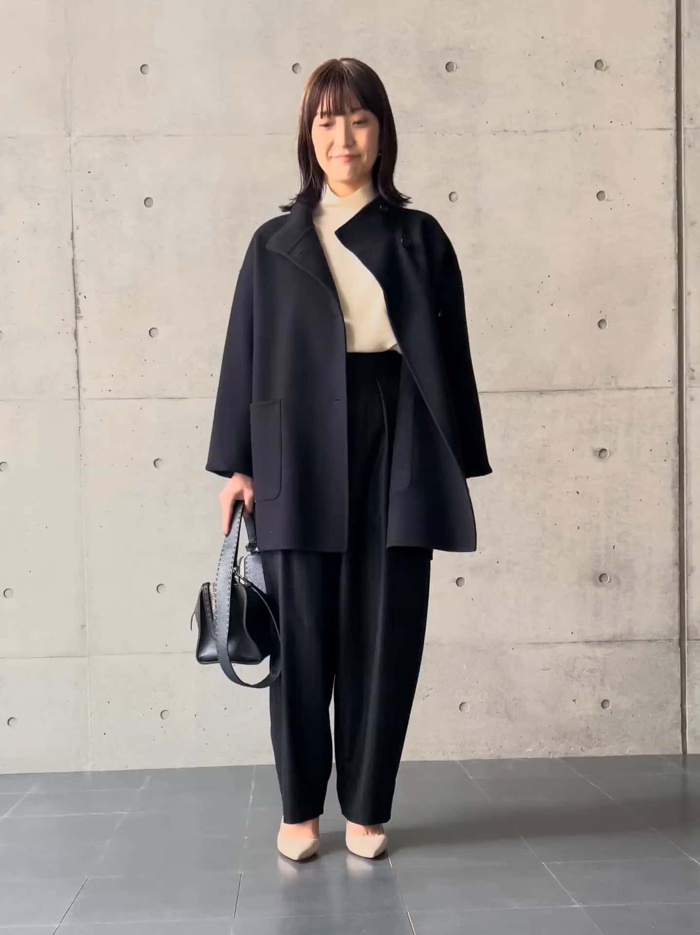 スタンドカラーのリバー仕立てコートは、ゆったりシルエットで羽織るだけできれいに決まります。