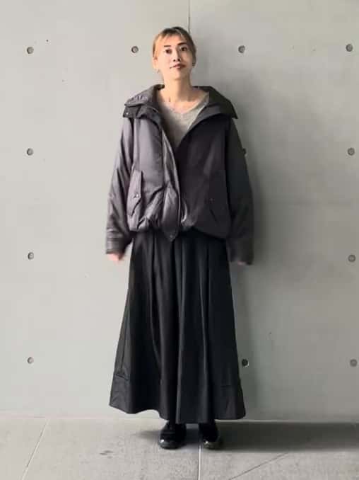 裾にドローコードが付いており、私のようにギュッと絞って、ブルゾン風に着ていただくこともできます。