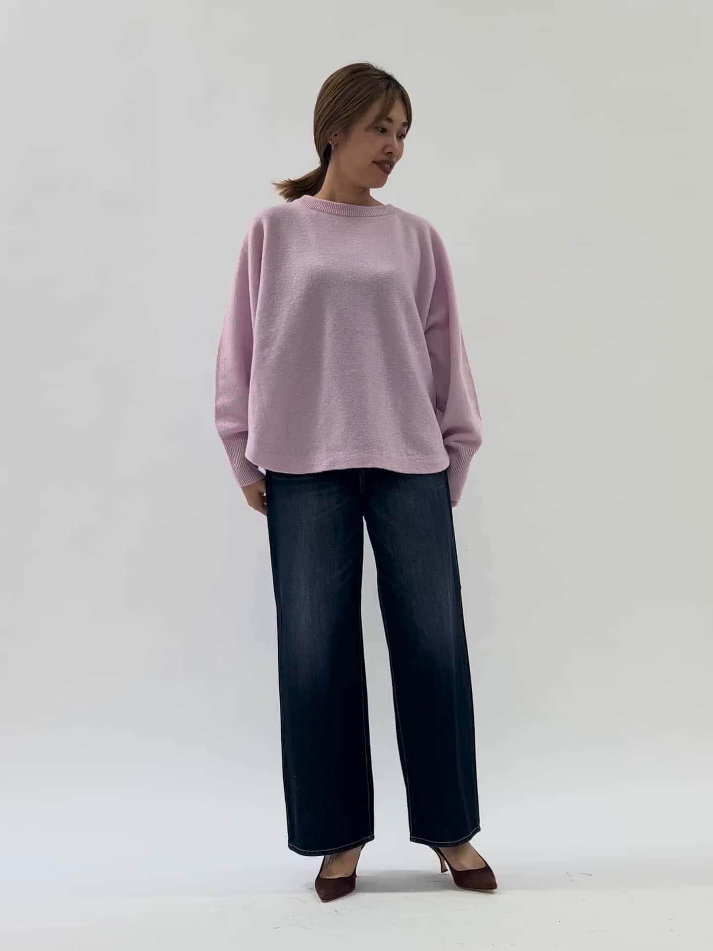 ピンクのニットにネイビーのワイドデニムパンツを合わせました。柔らかくくたっとした素材で、ジャストウエストの太めシルエットがバランス良く着こなせます。甘めのピンクニットも、濃いめのデニムやブラウンのヒールで引き締めることで大人っぽく仕上げました。高身長でもバランスよく着られるスタイリングです。