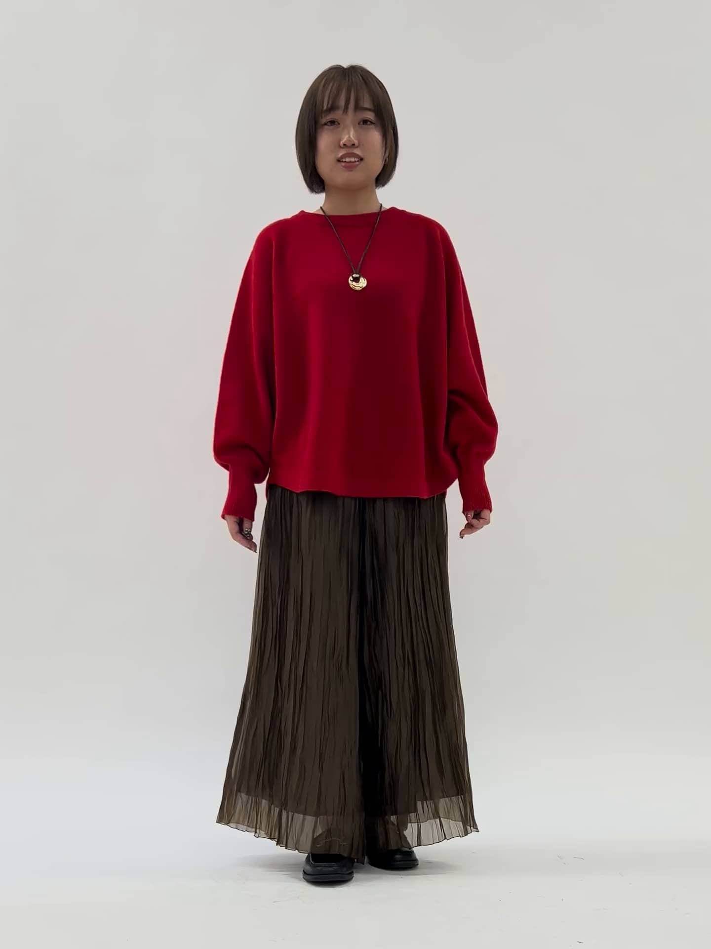 レッドのニットにカーキブラウンのランダムプリーツパンツを合わせました。パンツは縦長ラインが作りやすく、プリーツの表情で程よく抜け感をプラス。温かみのあるレッド×ブラウンの配色で、冬の装いに華やかさを添えるスタイリングです。ニットのサイズ感も程よく、小柄でもバランスよく着こなせました。
