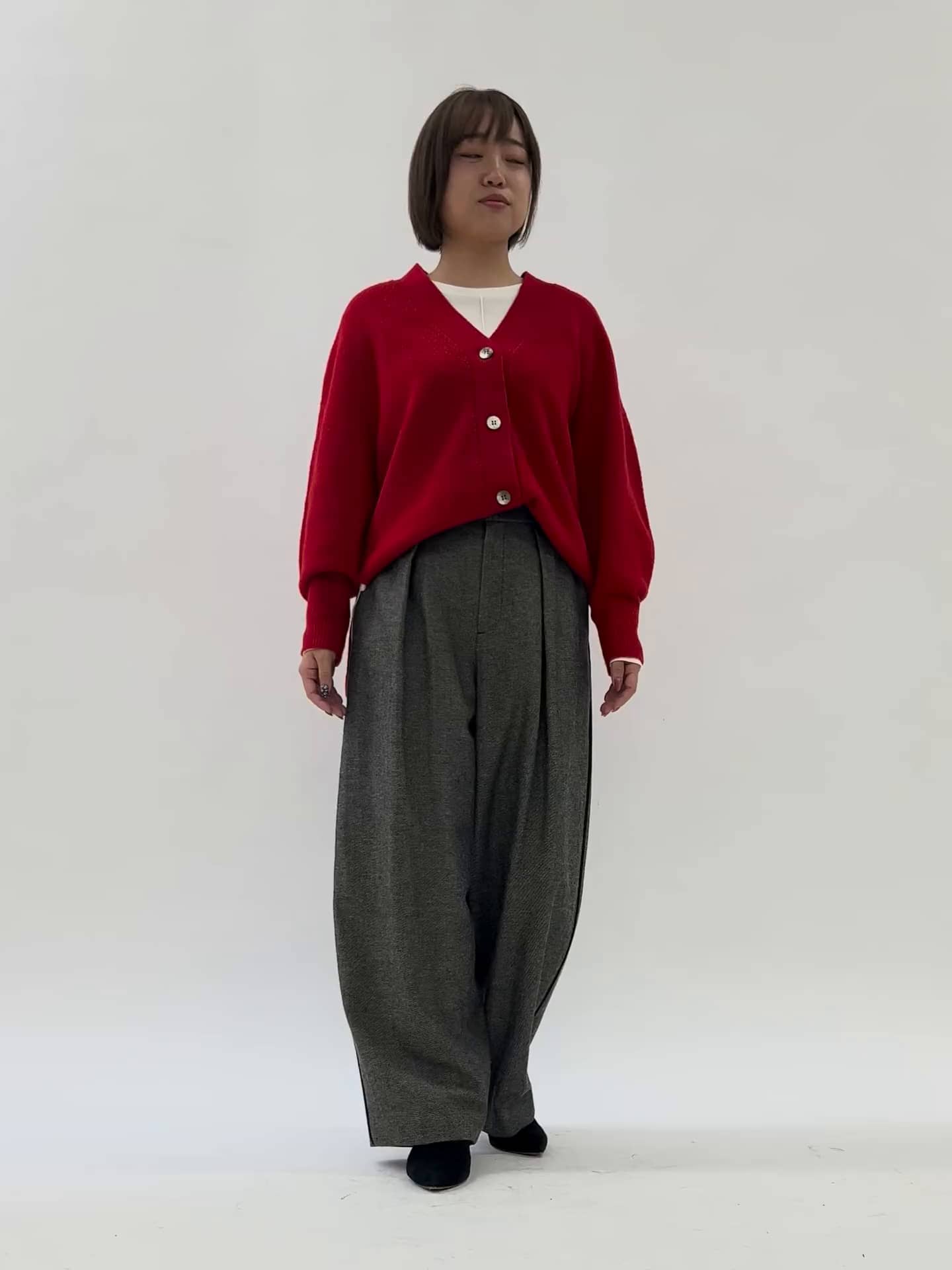 レッドのカーディガンにグレーのバレル型ワイドパンツを合わせ、シックながら程よく抜け感のある着こなしに。パンツは前だけインして小柄でもバランスを取りました💡ホワイトのインナーが爽やかさをプラスして、レッドの差し色が冬のスタイリングに華やかさを添えてくれます。