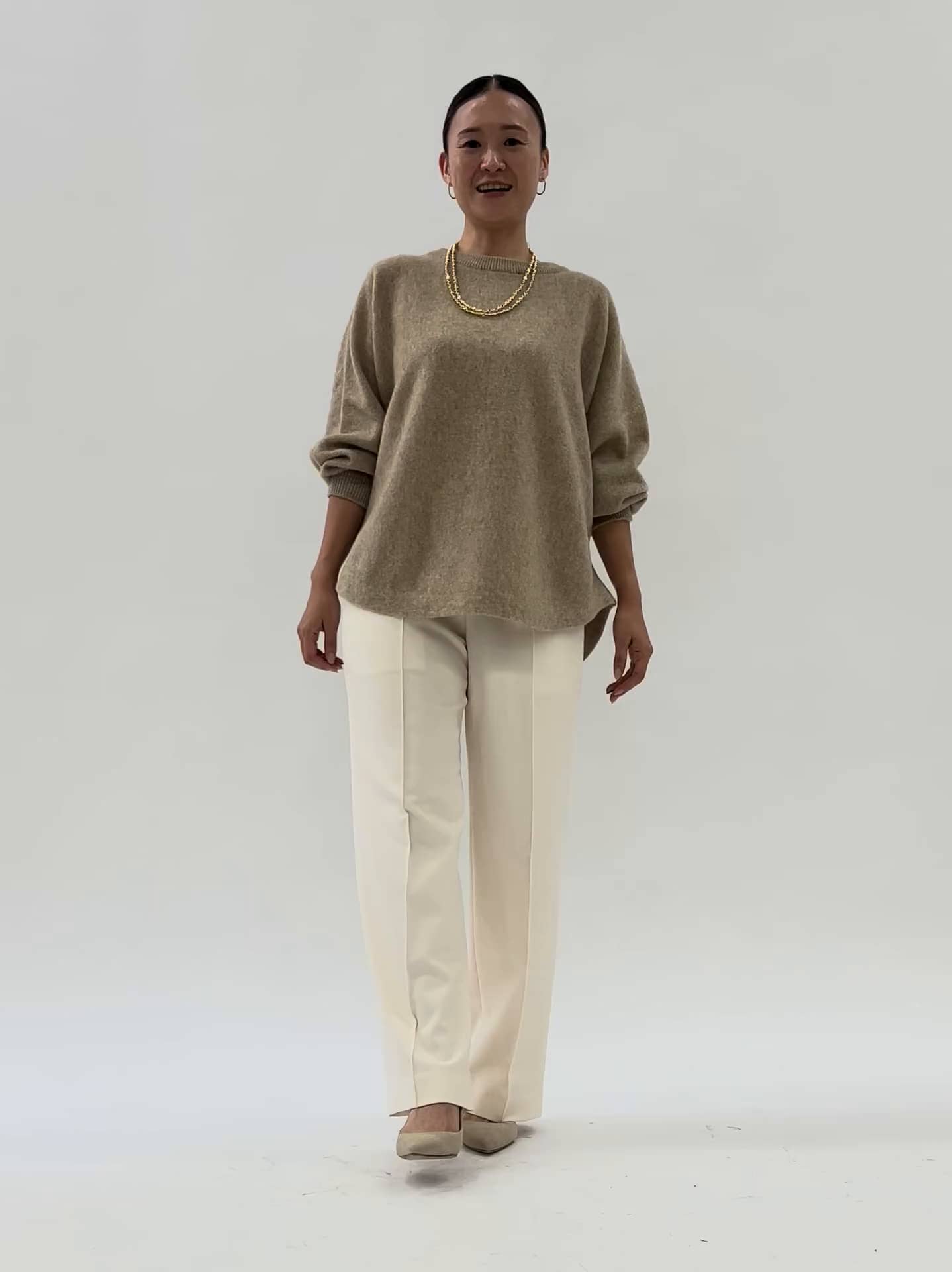 ベージュのニットはアウトして、ヒールでバランスを調整。ホワイトのTRストレッチパンツは吸湿発熱で暖かく快適な履き心地。程よくすっきりしたシルエットとセンターシームステッチで脚長効果も。小柄でもバランス良く、冬の澄んだ景色に映えるきれいめスタイルにおすすめです♩