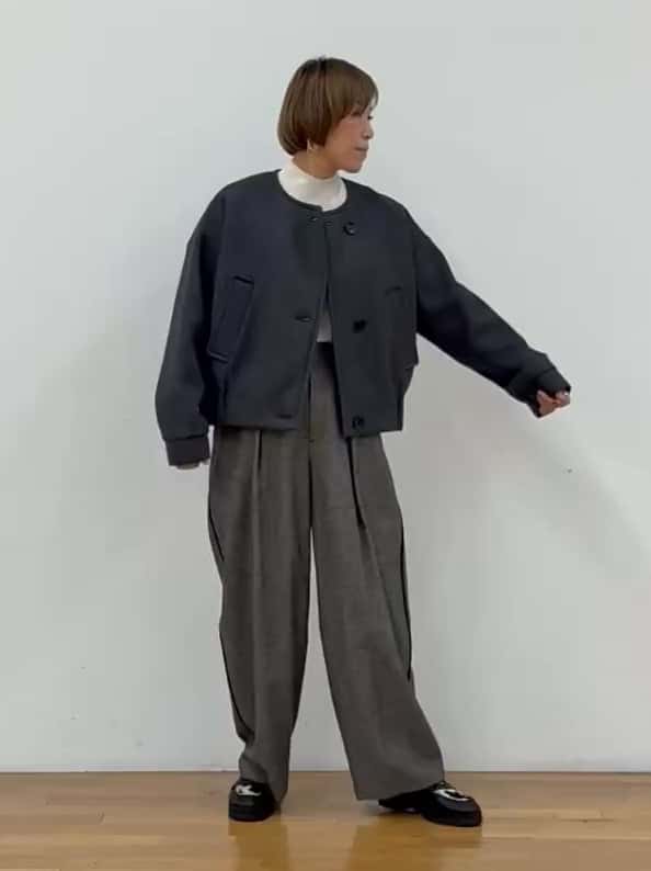 ボンディングの軽やかで、美しいフォルムの新型ショートコートには、バレル型のゆったりシルエットのパンツを合わせました。