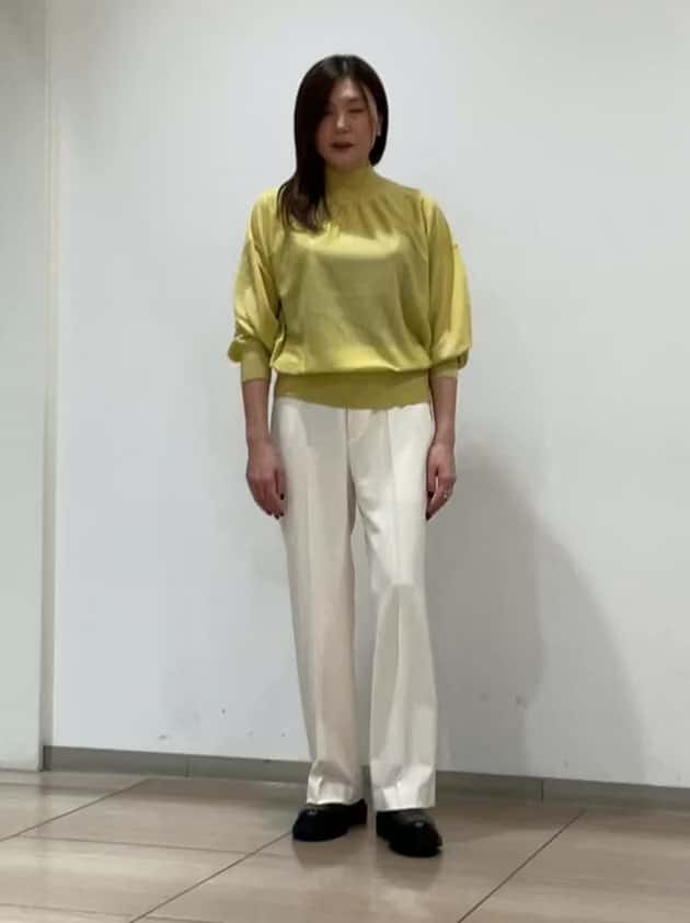 イエロー×オフの明るい配色で、冬の装いを軽やかに見せてくれます◎