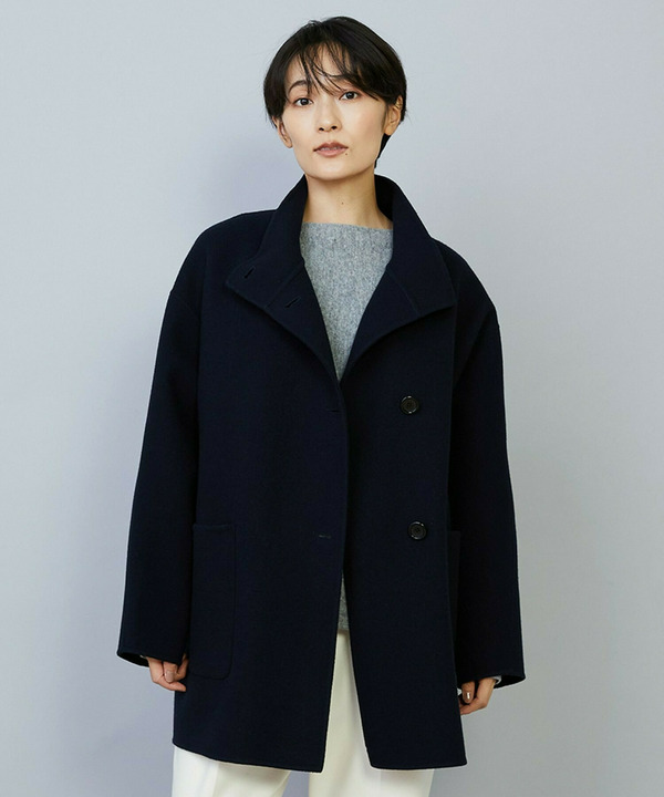 上質なスーパー140原料を使用したリバー仕立てのミドルコート。スタンドカラーの柔らかな返り衿が女性らしく、軽やかで品のある印象に。