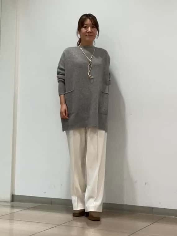 毎年人気のクーマラムカシミヤのニットが入荷しました!ベージュのボートネックニットに、オフホワイトのパンツを合わせた、柔らかなトーンの上品カジュアルスタイル。