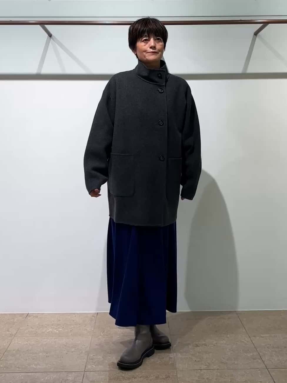 シルエットが綺麗なリバーコート。衿の開け方で印象が変わります。