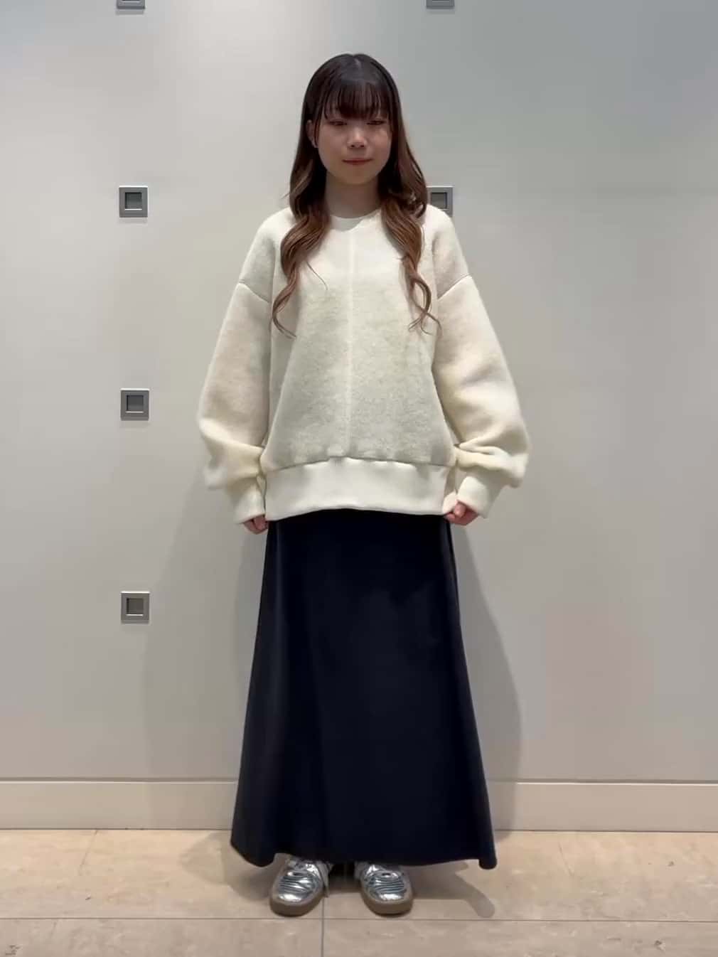 ふんわりしたジャージトップスにフレアスカートを合わせた秋にぴったりなコーディネート。トップスはジャージならではの軽さで、前後差のあるデザインがどこから見てもきれいなスタイルに。フレアスカートはニットとの相性抜群。スニーカー合わせでカジュアルさを出しました!