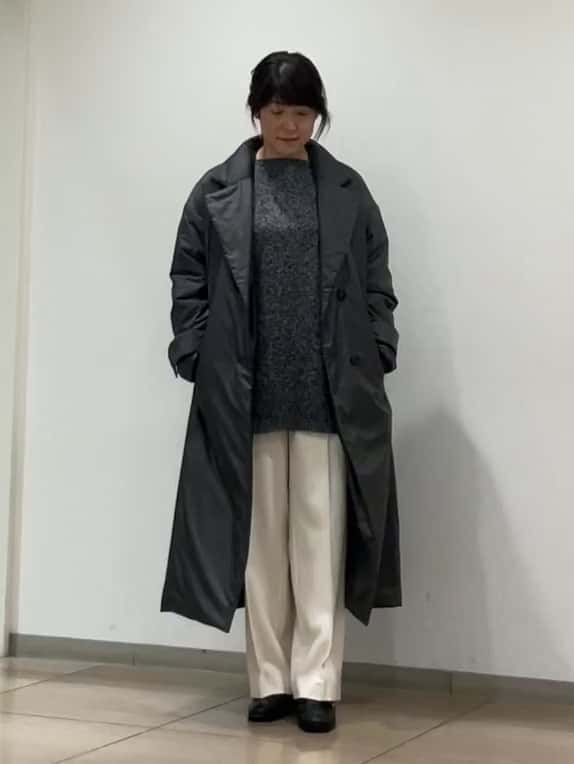 ゆったり身頃のニットは、細めの袖でバランス良くすっきりと。吸湿発熱素材のパンツを合わせて、軽やかで暖かい冬のワントーンスタイルに仕上げました。