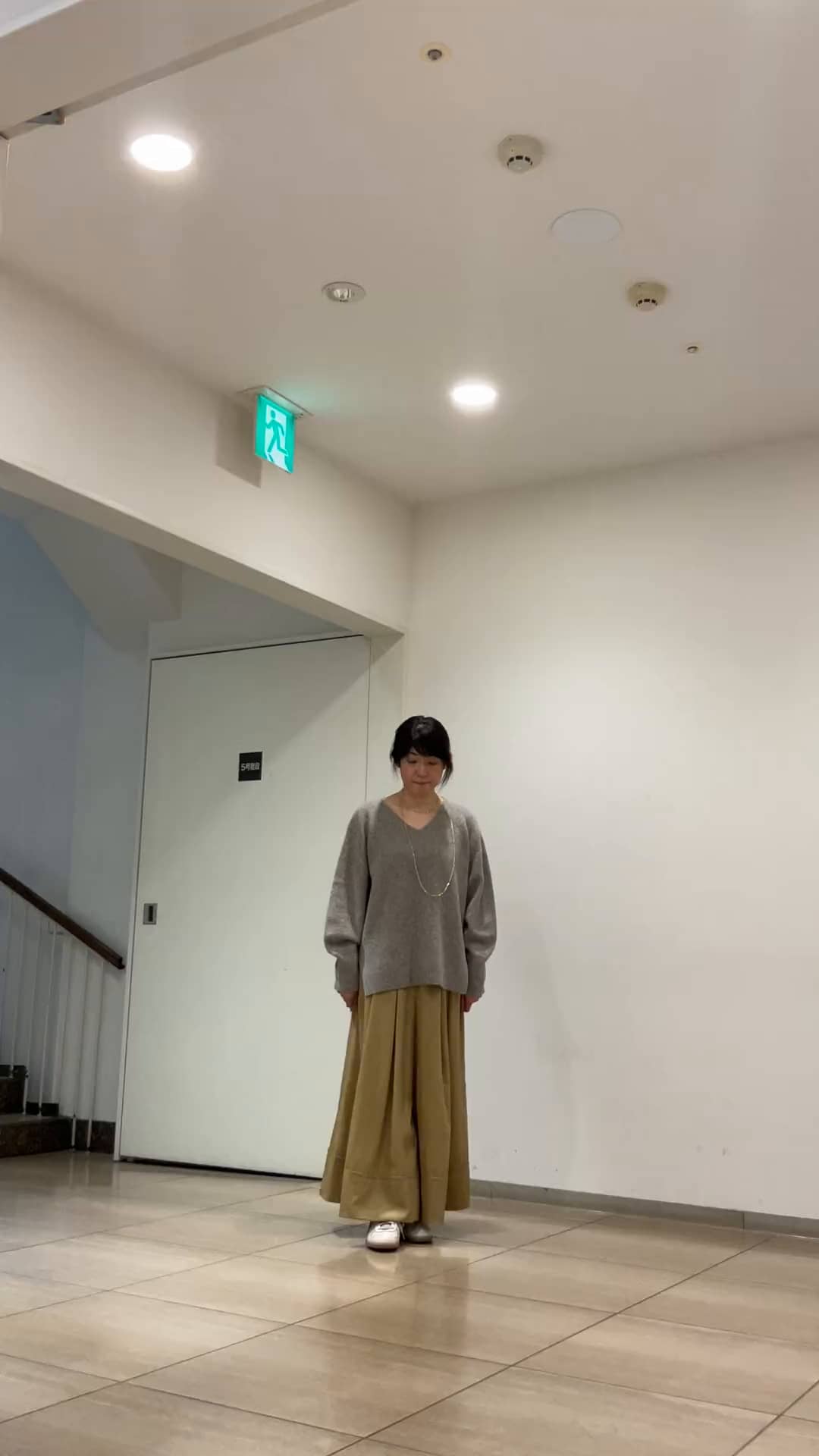 キュロットパンツはあえて2サイズを選んで長め丈に。動きのあるシルエットがスカート見えし、女性らしくベージュ×キャメルの優しいトーンで上品な抜け感スタイルに仕上げました。