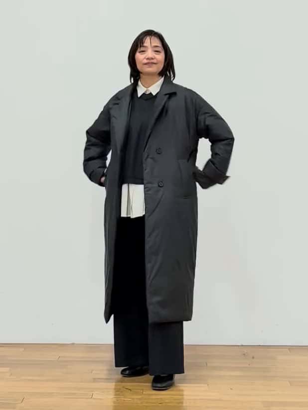 コートはゆったりっと着れてとても軽くて暖かいです。光沢のある素材が素敵だし、左右のひもを引っ張ると簡単に後ろを絞れるので、細見え効果もありです。