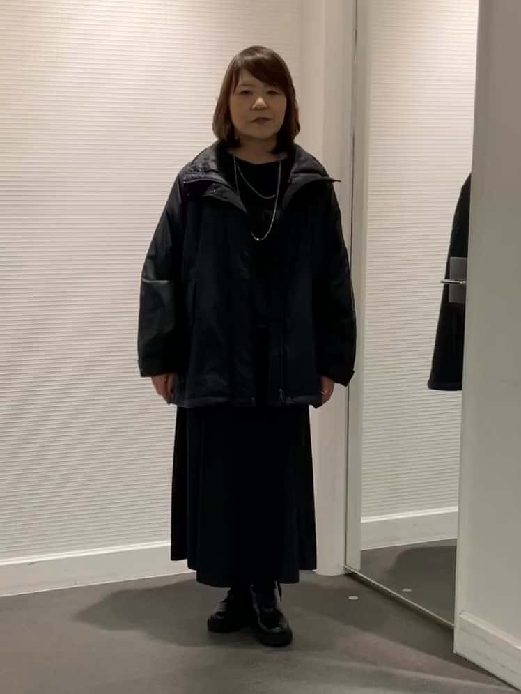 断ち切りデザインが印象的なトップスと、すっきり見せが叶うフレアースカートをグレーで統一。ブラックのコートを重ねて、上品で洗練された冬のモノトーンスタイルに。