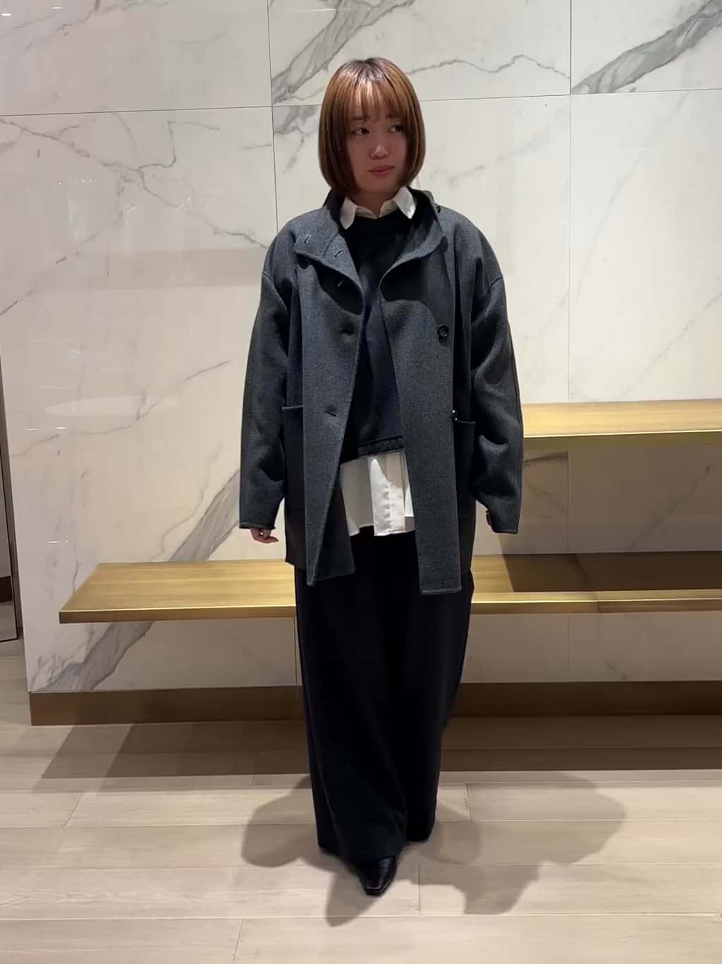 リバー仕立てコートは、軽やかで女性らしい雰囲気が魅力です。グレーのワントーンでまとめて、洗練された大人のスタイルに仕上げました。