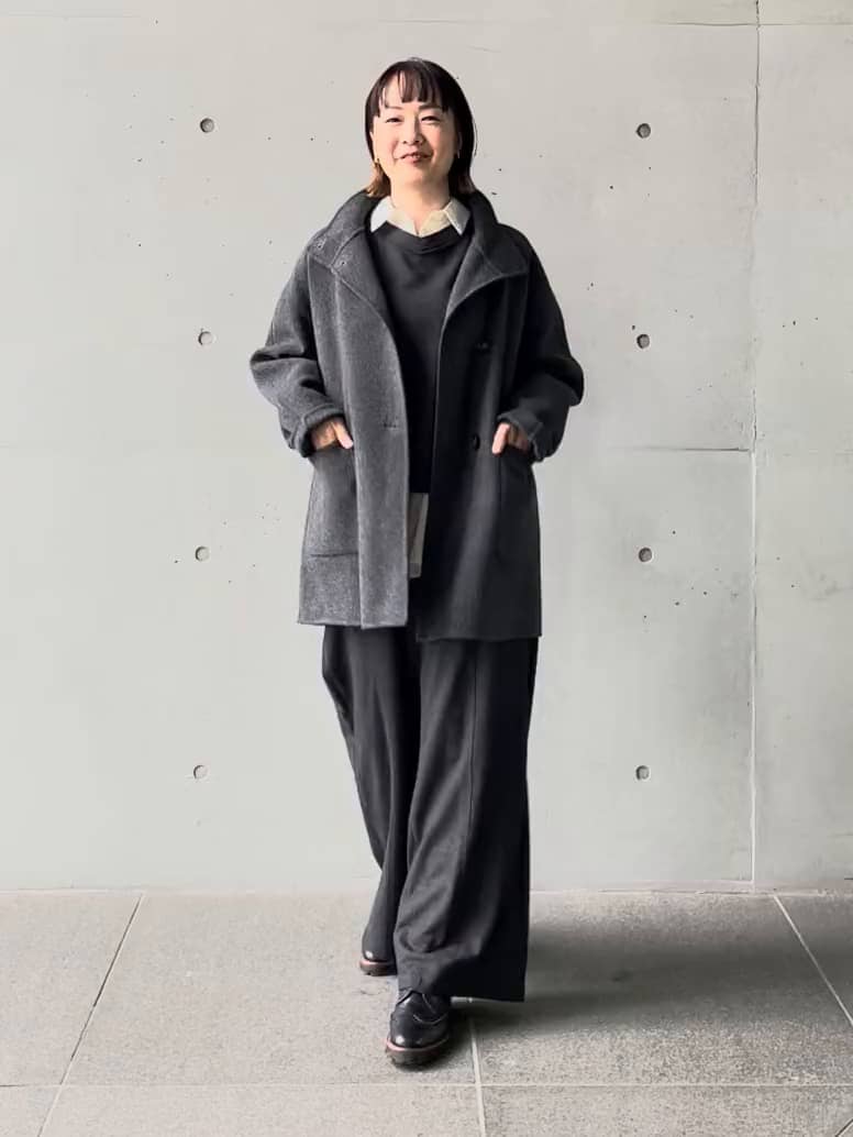 同素材のワイドパンツで統一感を出しつつ、きれいめにもカジュアルにも着回せる大人の冬スタイルです。