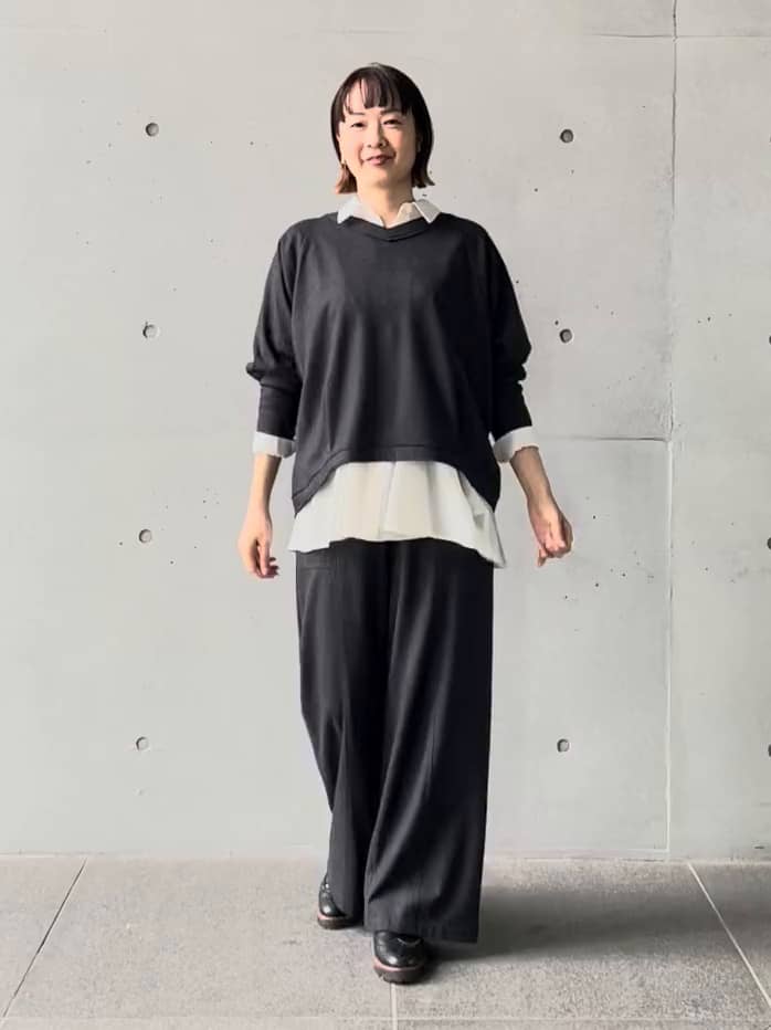 断ち切りデザインのトップスとワイドパンツのセットアップは、ほどよい抜け感がありながらもきちんと見える大人のバランスです。
