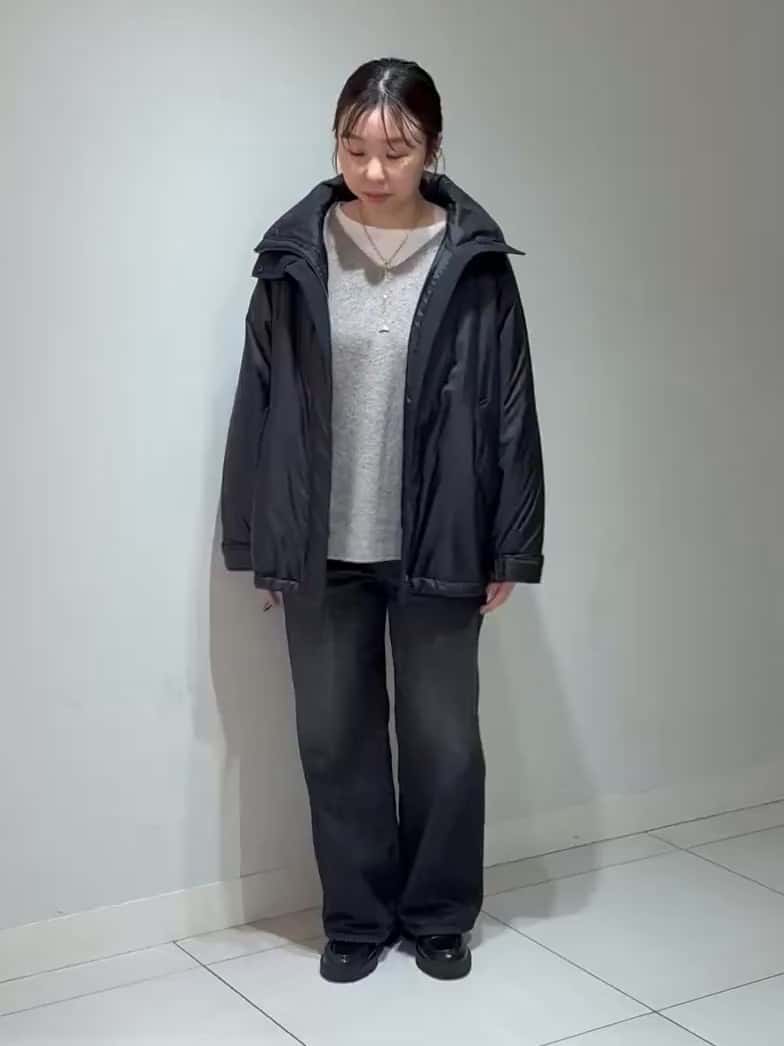 大きめのスタンドカラーが顔まわりを包み込むように見せてくれる中綿コート。