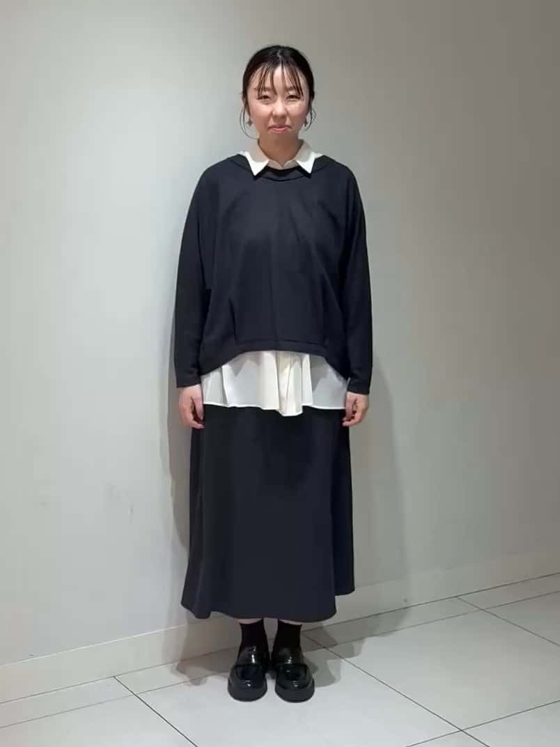 同素材のフレアスカートは、切り替えラインでスタイルアップ効果も◎