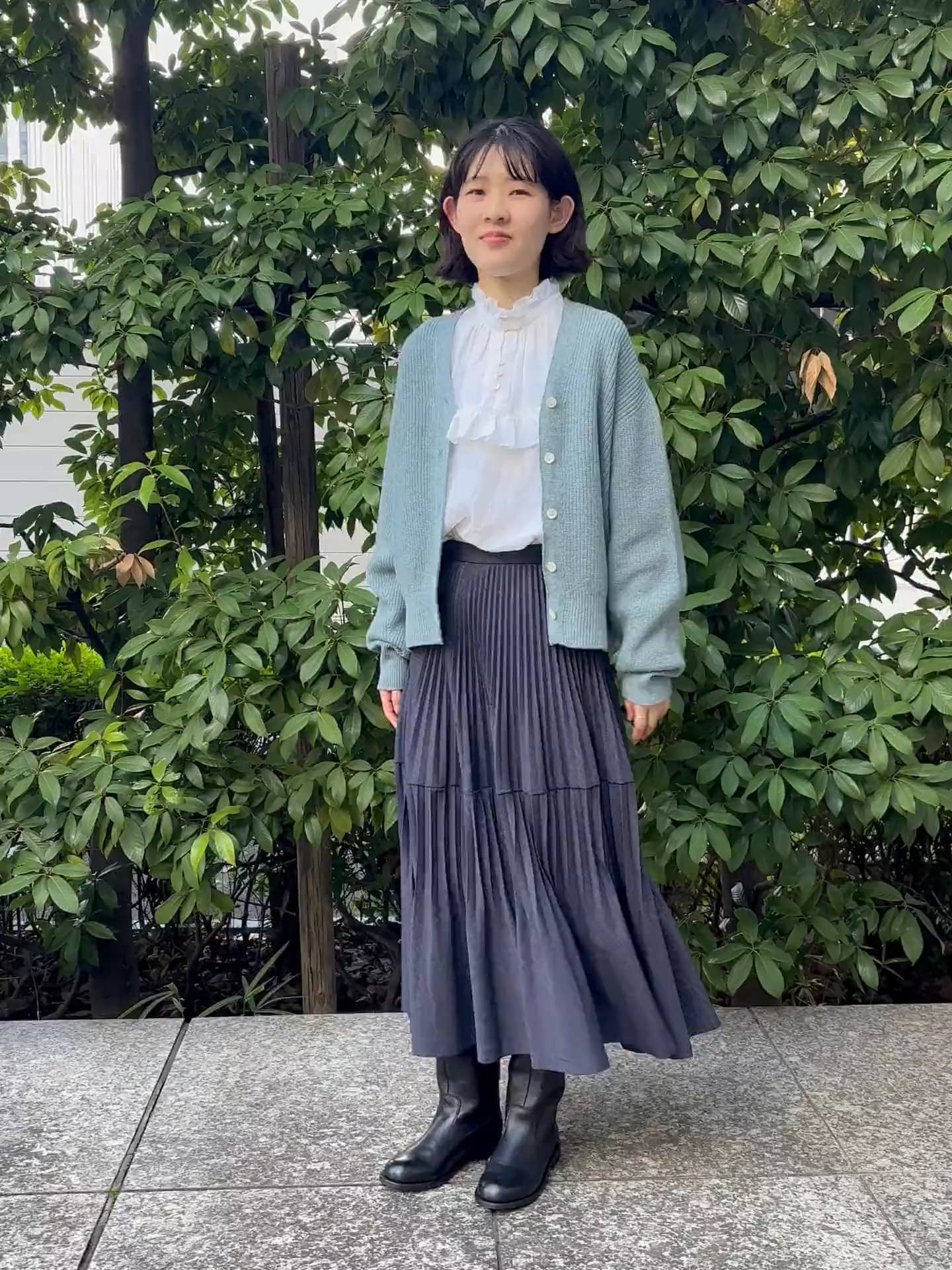 プリーツスカートや、ブラウスのフリルが可愛らしい印象ですが、デザインや生地に上品な大人っぽさがあります。