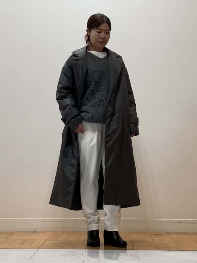 軽くて暖かい中綿コートに、柔らかな風合いのクーマラム×カシミヤニットを合わせたスタイリング。