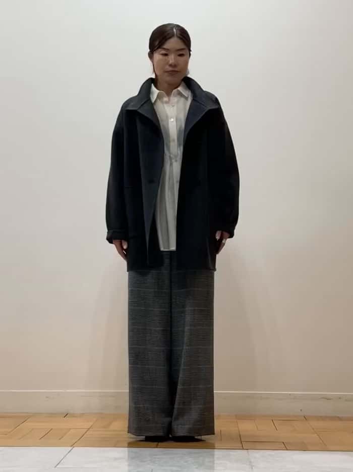 上品なグレーのリバー仕立てコートに、しなやかなウールブラウスとチェックのワイドパンツを合わせた大人の冬スタイルです。