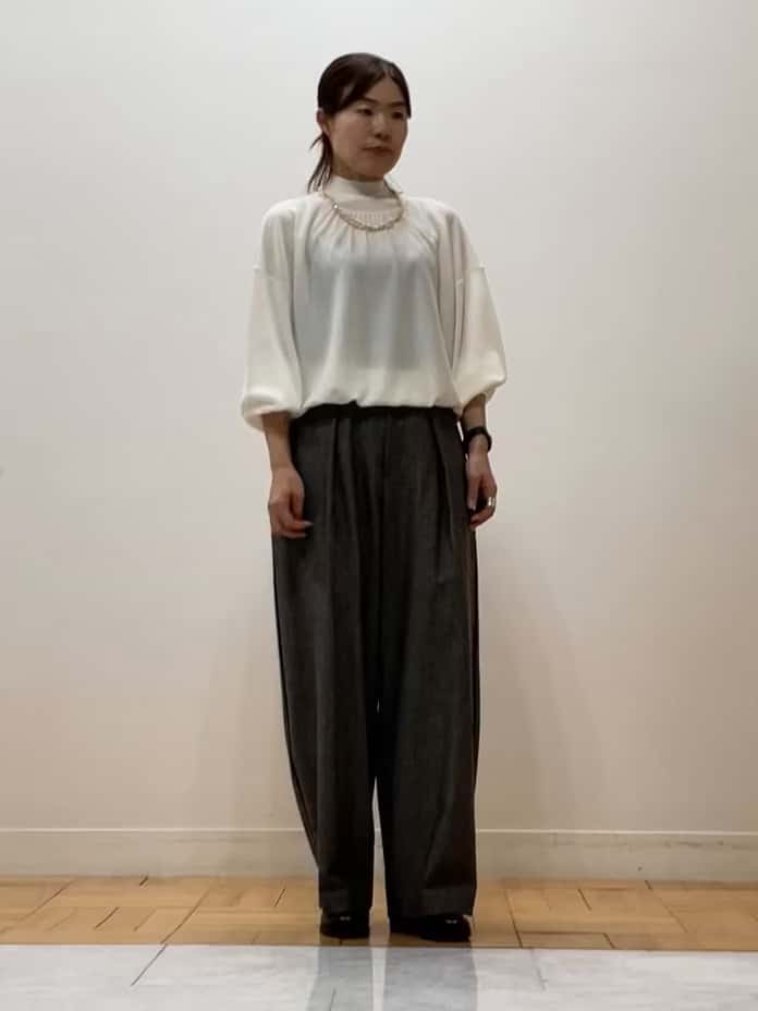 ニットは肩や袖のギャザーで女性らしいフォルムに仕上げ、パンツは深めのタックと幅広シルエットでモダンな印象。上下の素材感のコントラストも楽しめるスタイルです。