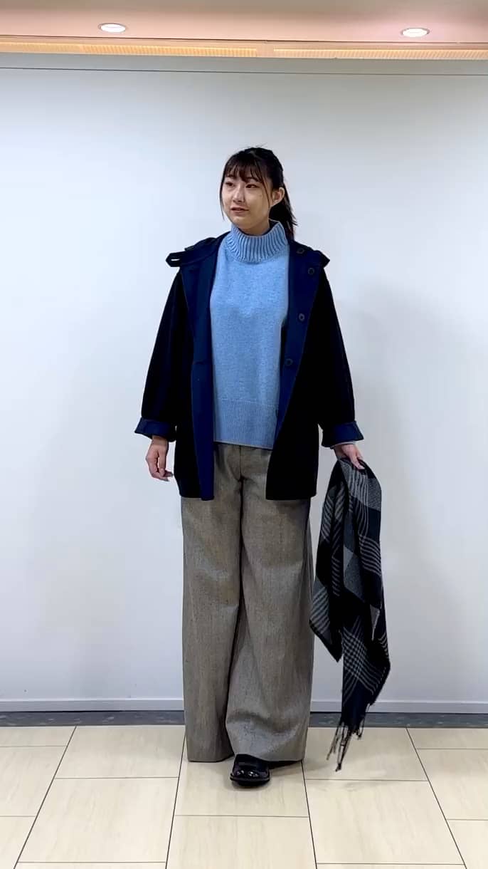着用感:ウール素材のワイドパンツ。長めの着丈で、裾の長いトップスと合わせてもバランスが良いです。
