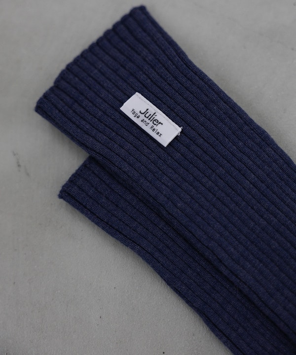 柔らかブルーレギンスにライトグレートップスを合わせて、都会的で洗練されたコーディネートに。