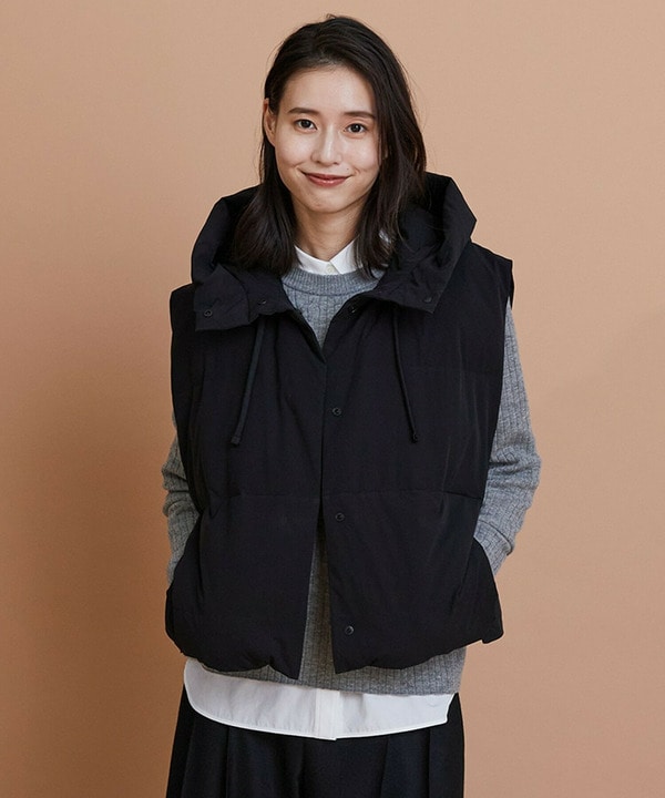 トップスはスッキリしたタートルネックで、スカートはタックフレアーのドッキングワンピースに、フードのついた中綿ベストを合わせました。ワンピースもベストも軽くて動きやすいので、着心地がとても良いです。