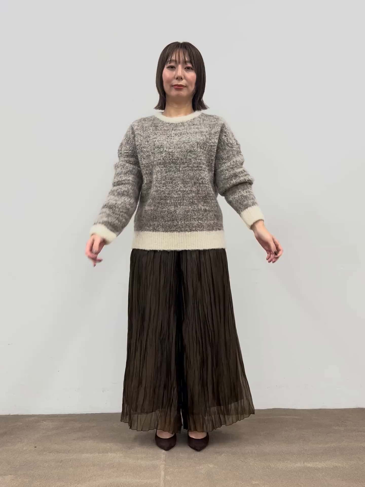 南米ウールとペルーアルパカの起毛ニットは、光沢とぬめり感で大人っぽく。オーガンジーのランダムプリーツパンツで縦長ラインを演出。ブラウンで統一すれば、女子会や忘年会などカジュアルさも加わる華やかなコーデに。ウエストはひと折りしてバランス調整しています。
