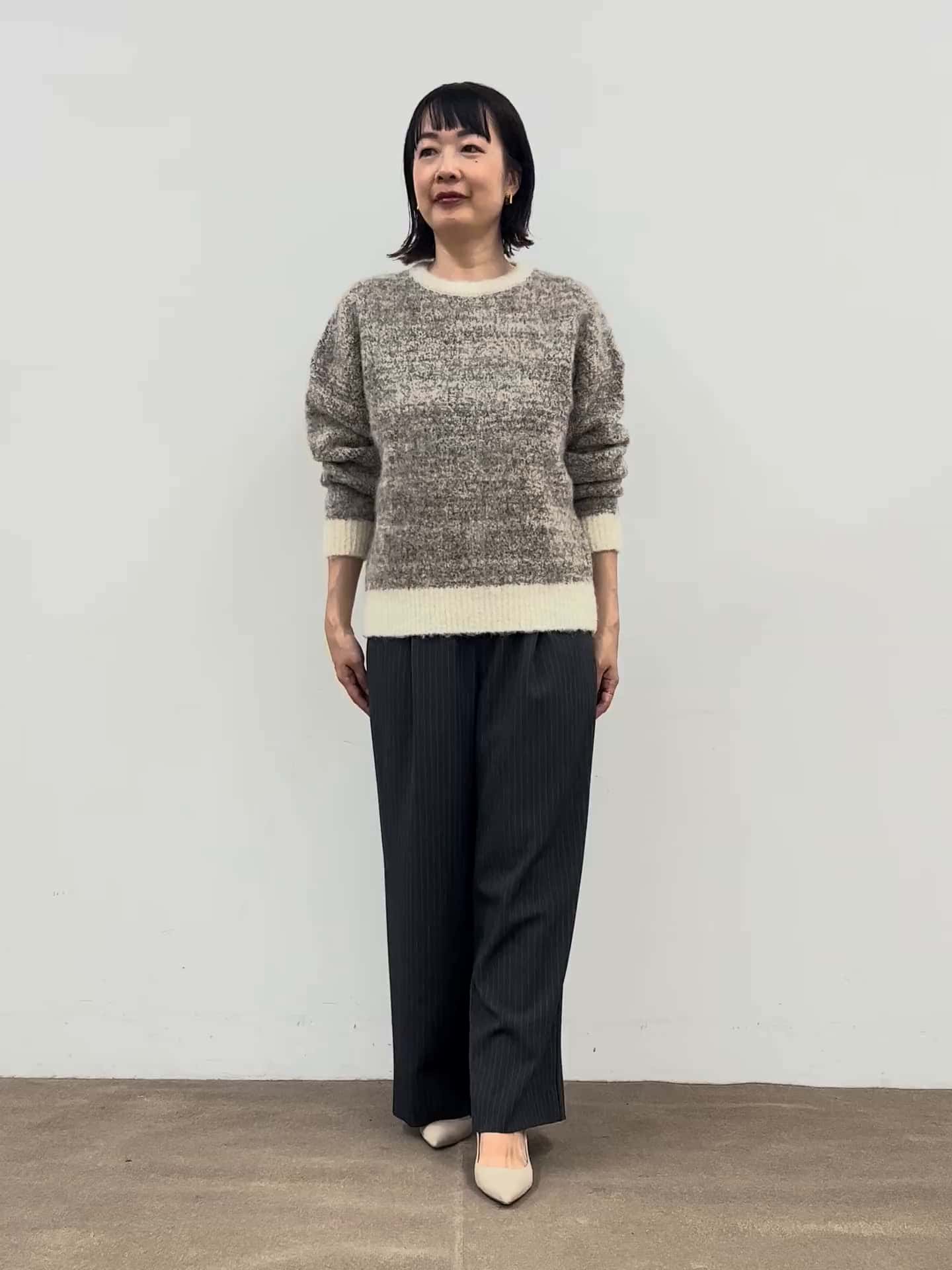 南米ウールとペルーアルパカの起毛ニットは、表情豊かな編地が主役の1枚。メランジ調のストライプワイドパンツでシンプルにまとめ、ブラウン×グレーの配色でカジュアルにもきれいめにも対応できます。ニットは長すぎず短すぎないので、小柄な方から高身長の方まで幅広い方々に着やすいアイテムです◎
