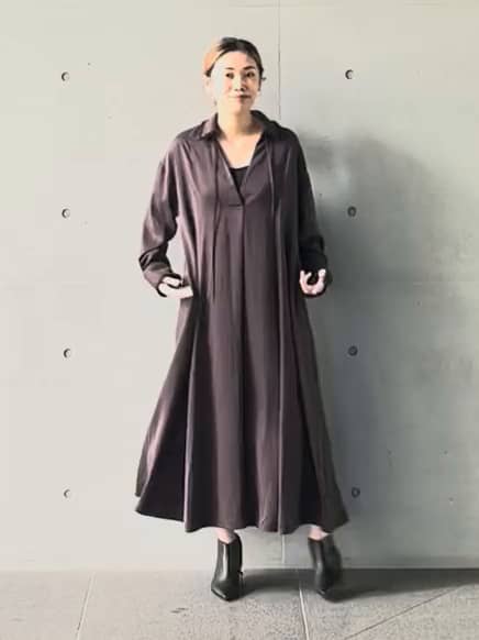 ほどよいふくらみと軽さのある生地で、動くたびにきれいに広がるワンピースです。つるっとした生地にツイードの切り替えを合わせて、さりげなく見え方に変化をつけました。落ち着いたブラウンで、今年らしいスタイリングが楽しめます◎フィブリルサテン B0261EFA150 2①ブラウン ゆったり