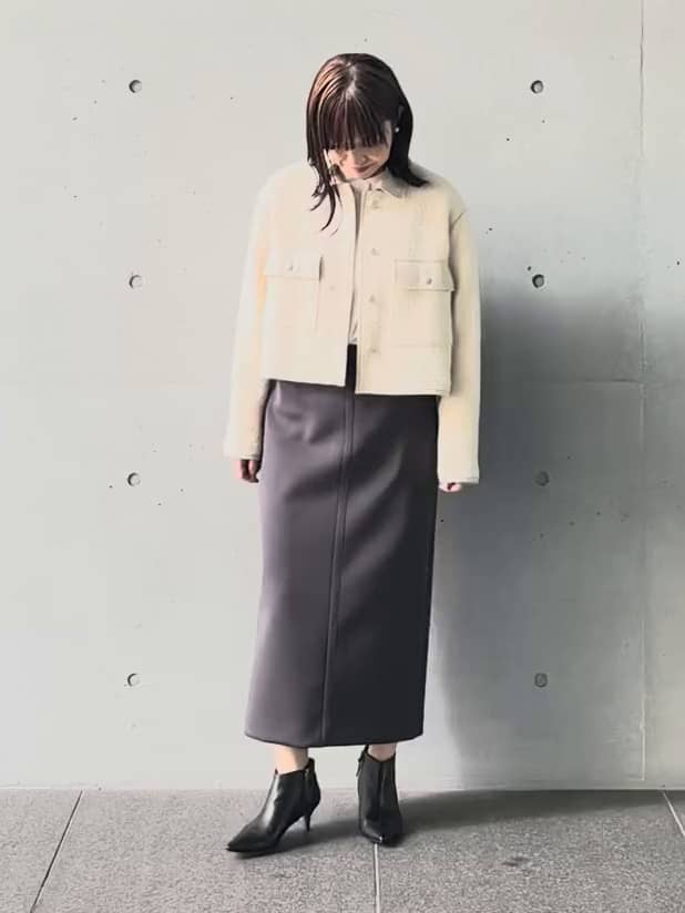 ジャケットのラフなほぐしデザインでこなれ感を出しつつ、ブラウスのギャザーとスカートの縦切り替えで全体をすっきり見せられるのがポイント。ジャケットを脱いでもブラウスやスカートは単品で使えるので、日常からオフィスまで幅広く活躍します。