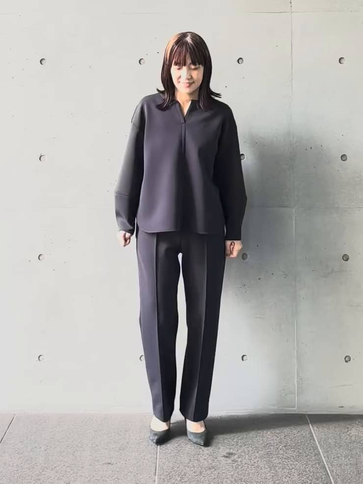 ストレートパンツはラインを拾いすぎず、センターピンタックでスタイルアップも◎。