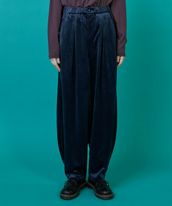 着用感 : ワイドテーパーシルエットのベロア素材のパンツ。