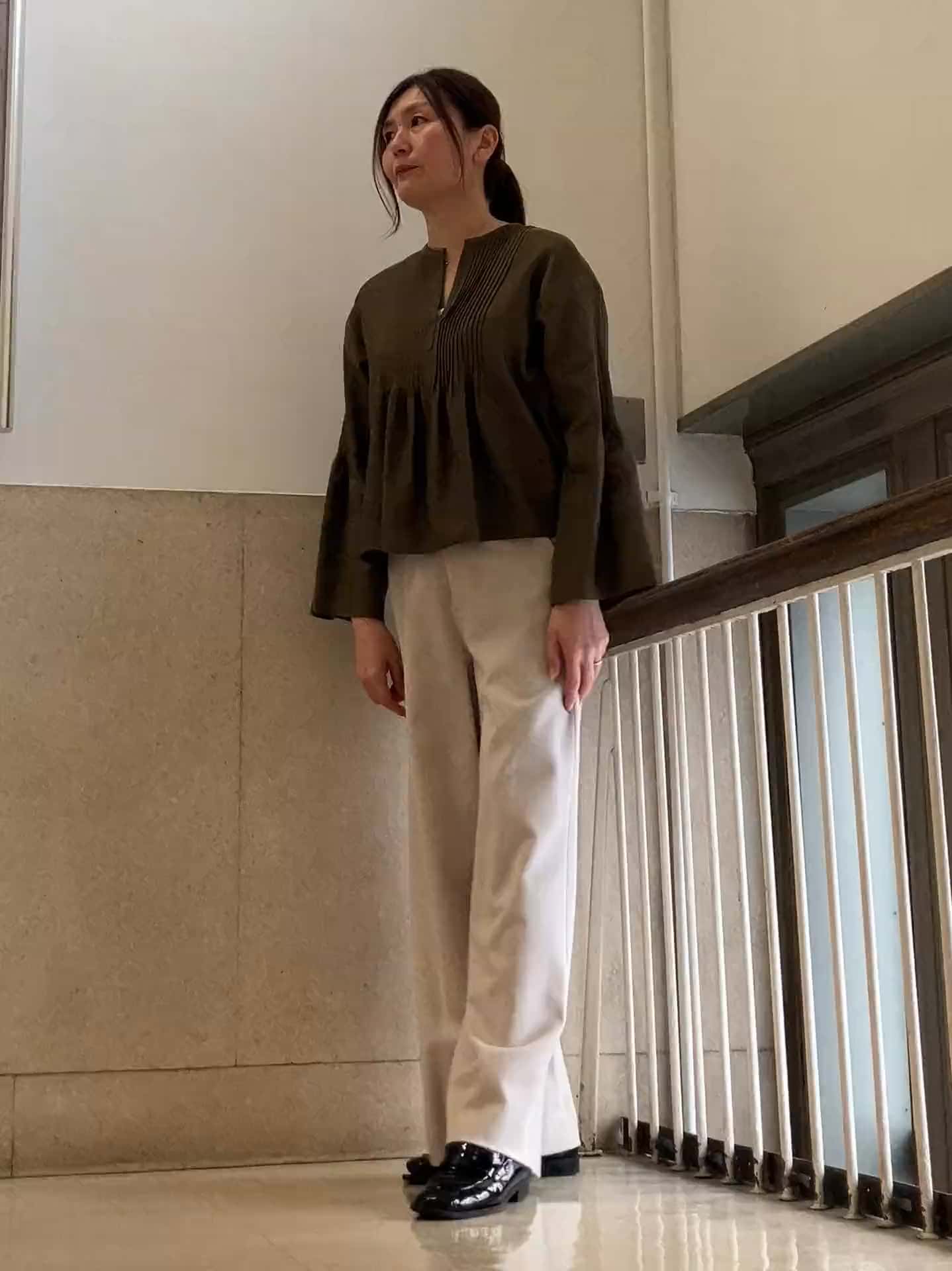 カーキのブラウスは、光沢となめらかさのある生地にリネンの自然な表情がほどよく混ざり、見た目にも軽やかです。細かなピンタックからふわっと広がる形がきれいで、一枚で立体感が出ます。