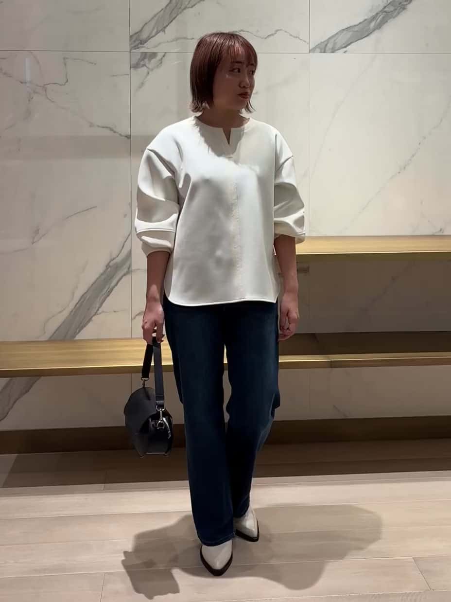 太めのステッチが効いたトップスは、首元の重なりがすっきり見えて、袖の立体感が形をきれいに見せます。裾の丸みでデニムとも自然につながり、トップスの白が全体を明るく整えます。