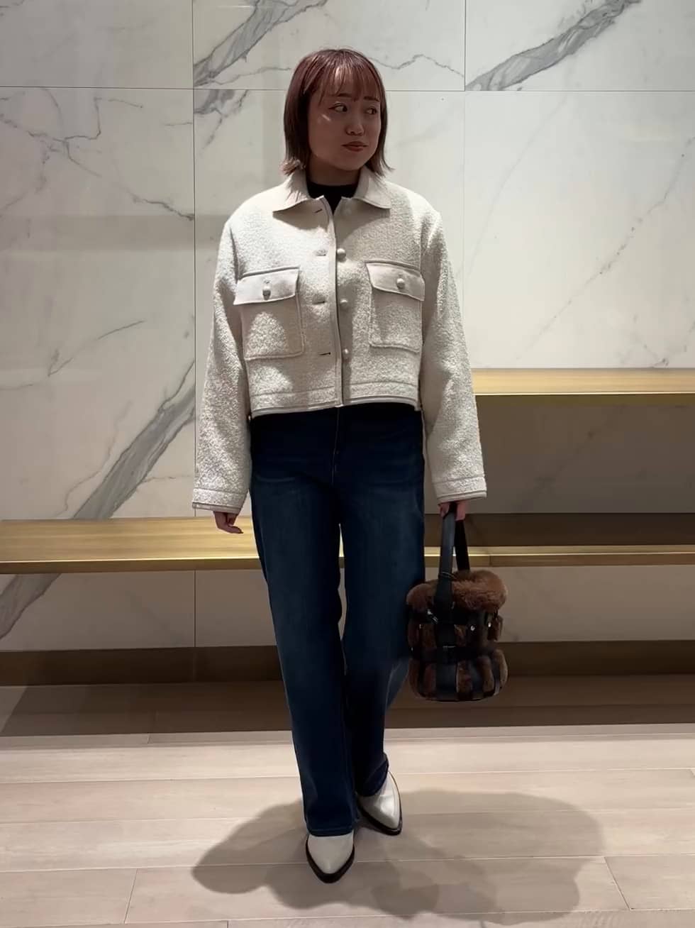 ツイードジャケットは、ほどよいゆるさがあって重たくならず、デニムと合わせるだけで全体がすっきり整います。