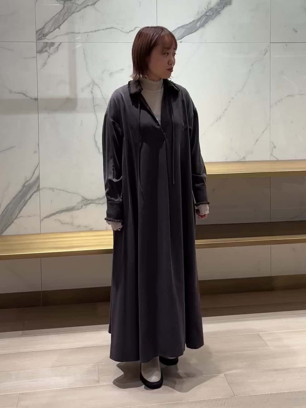 ワンピースは、広がりすぎないシルエットと襟と袖口の異なる質感のツイードがほどよいアクセントになるので、一枚でも着映えします。