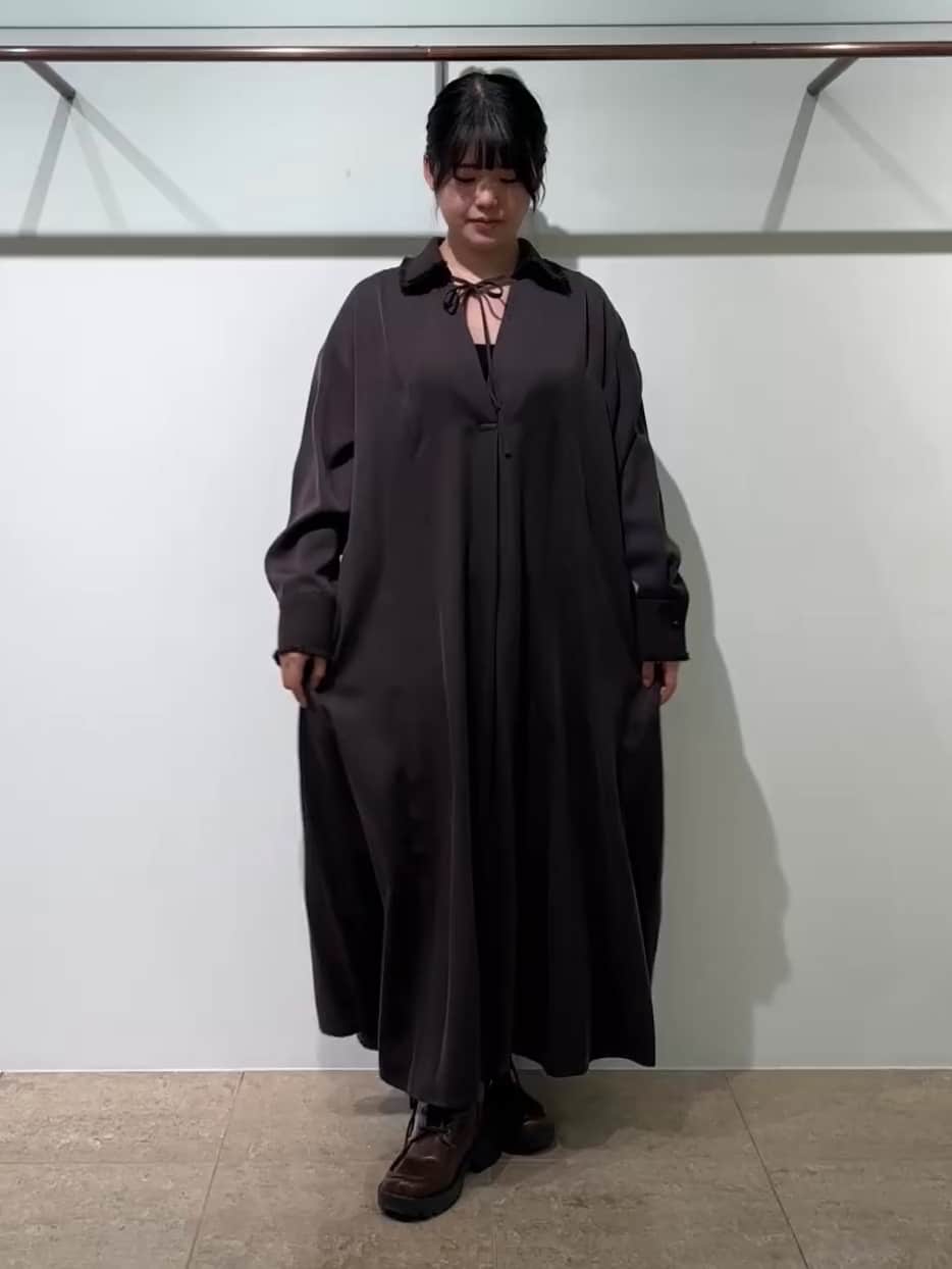 ツイードの衿と袖が可愛いワンピース。つるっとした光沢のある素材でエレガントに着ていただけます。61EFA150 2/① ブラウン