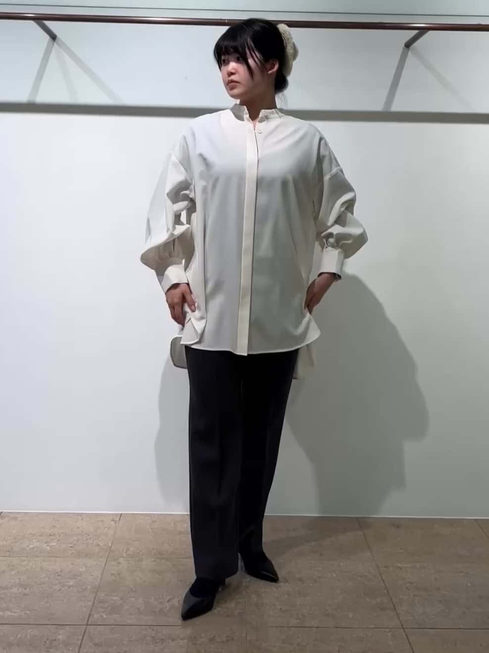 たっぷりギャザーが入ったブラウス。ドロップショルダーで抜け感があるフォルムが綺麗です。パンツは美脚シルエットのスッキリとしたラインが綺麗でボリュームのあるブラウスと合わせやすいです。61EFB001 2/① オフ61BUP232 2/② ダークグレー