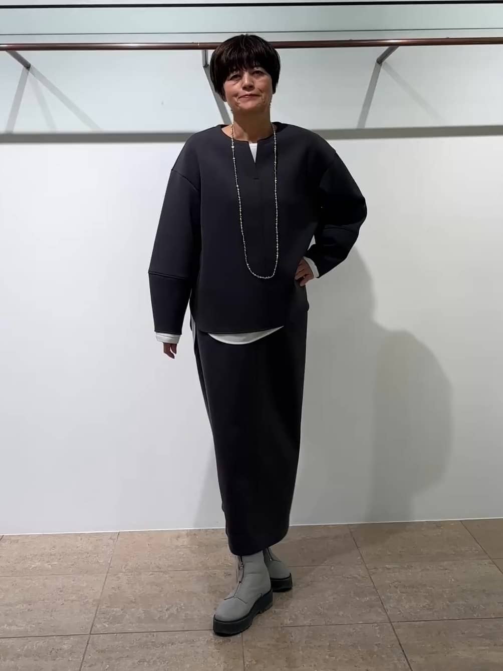 太めのステッチがアクセントのセットアップ。肌触りも柔らかくとても軽いです。スカートはすっきりシルエットできれい目に着られます。