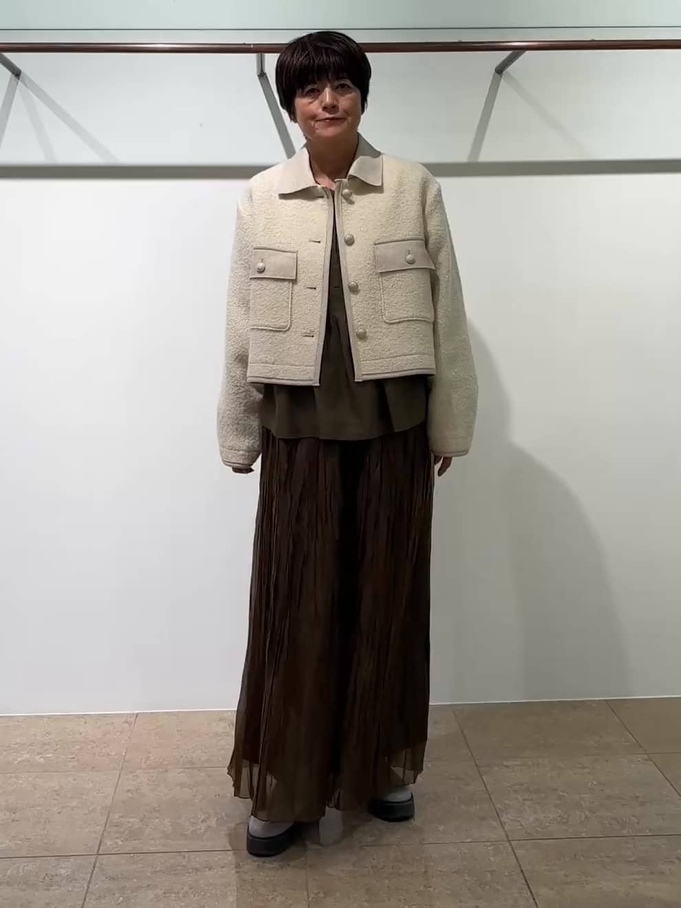 上品な短丈のジャケットにピンタックがポイントのブラウスを合わせました。パンツは光沢が綺麗なランダムプリーツ。抜け感がありおしゃれに着ていただけるコーディネートです。61EFJ120 2/① アイボリー61EFB002 2/① カーキ61EFP096 2/① カーキ