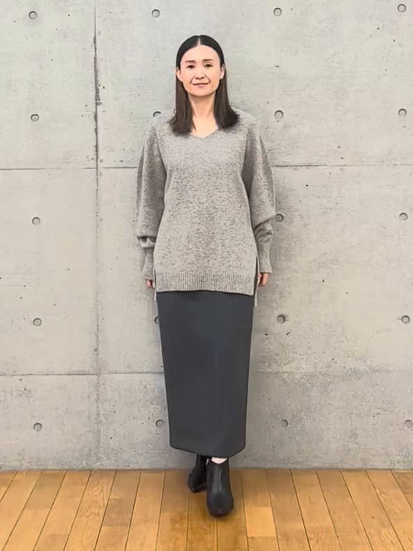 ニットはほどよく開いたVネックで顔まわりが明るく見え、前後差のある裾が重さを感じさせない形です。ゆったりしていて体に沿わないので、上半身を自然にすっきりまとめたい方に向いています。