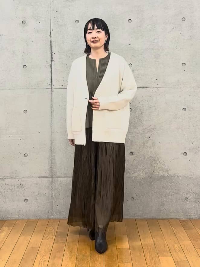 カーディガンは軽く形がきれいに出て、前ボタンが全体の締め役になります。羽織るだけで上半身がすっきりまとまります。