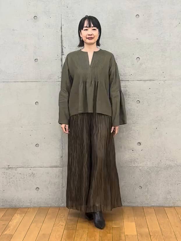 ブラウスは光沢と落ち感がきれいに出る素材を使っていて、細かなピンタックで上半身がすっきり見えます。裾に向かって広がる形なので、自然に立体感が出て一枚で印象が作りやすいです。