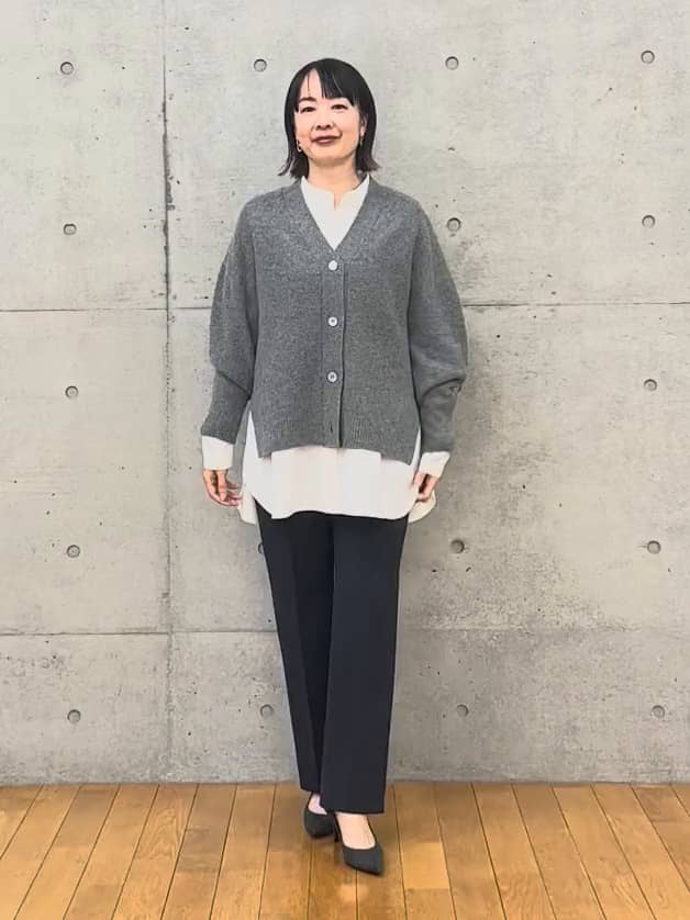軽さのあるブラウスに、柔らかい風合いのカーディガンを重ねることで、かたくなりすぎず程よいきちんと感を出しています。下はまっすぐ見えるパンツで全体の形を引き締め、上半身とのバランスをすっきり整えています。