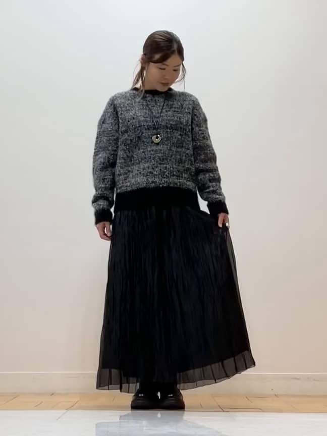 パンツはとても細い糸で作った軽い素材で、光が当たるときれいに見える表情です。動きのある折り目がほどよく力を抜いてくれるので、黒同士でもかたくなりません。すらっと見える形で、ニットの存在感もしっかり引き立ちます。