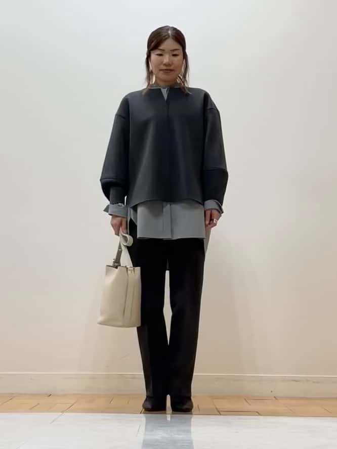 ブラウスは軽やかでギャザー入りのドロップショルダー、パンツはセンターピンタックで美脚見え。ダークグレー×ライトグレーのレイヤードでこなれたセットアップスタイルに。