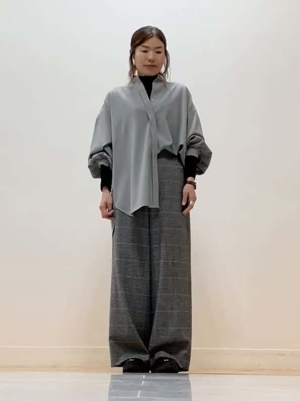 バンドカラーブラウスは、ギャザーとドロップショルダーで抜け感のあるフォルム。軽やかに羽織れるのでボトムを選ばず着回せます。